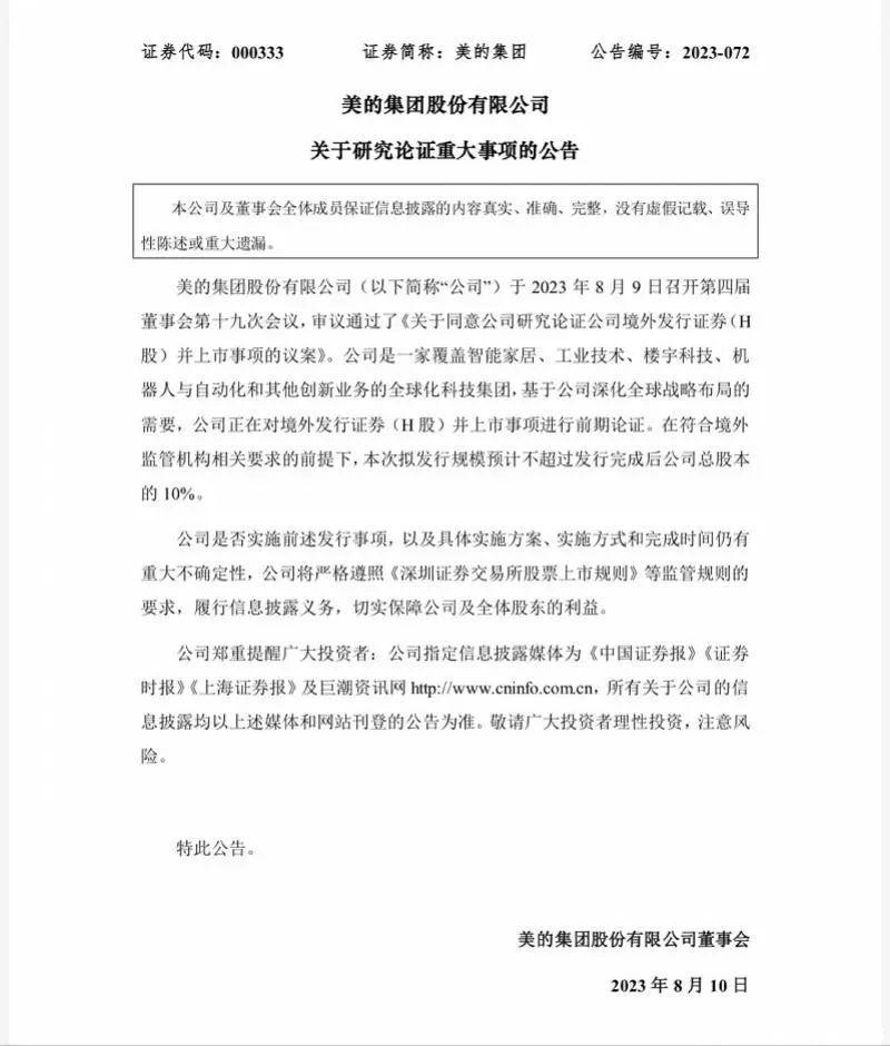南齐湾财社记者获悉,8月9日晚间,好意思的集团发布公告称,公司第四届董事会第十九次会议决议:公司正在对境外刊行证券(H股)并上市事项进行前期论证。在合乎境外监管机构经营条款的前提下,本次拟刊行范畴展望不逾越刊行完成后公司总股本的10%。该议案获取今日董事会全票首肯。